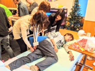 ベッドとリクライニング車椅子を使って完全側臥位と回復体位を全員で調整と体験を行った。